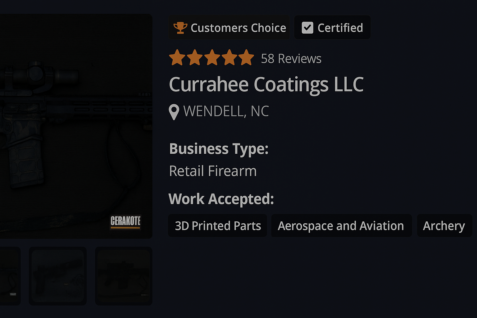 Cerakote is renowned for its exceptional durability, providing superior resistance to wear, chemicals, and corrosion. Rest assured, at Currahee Coatings, we guarantee long-lasting and robust finishes for all coated items.